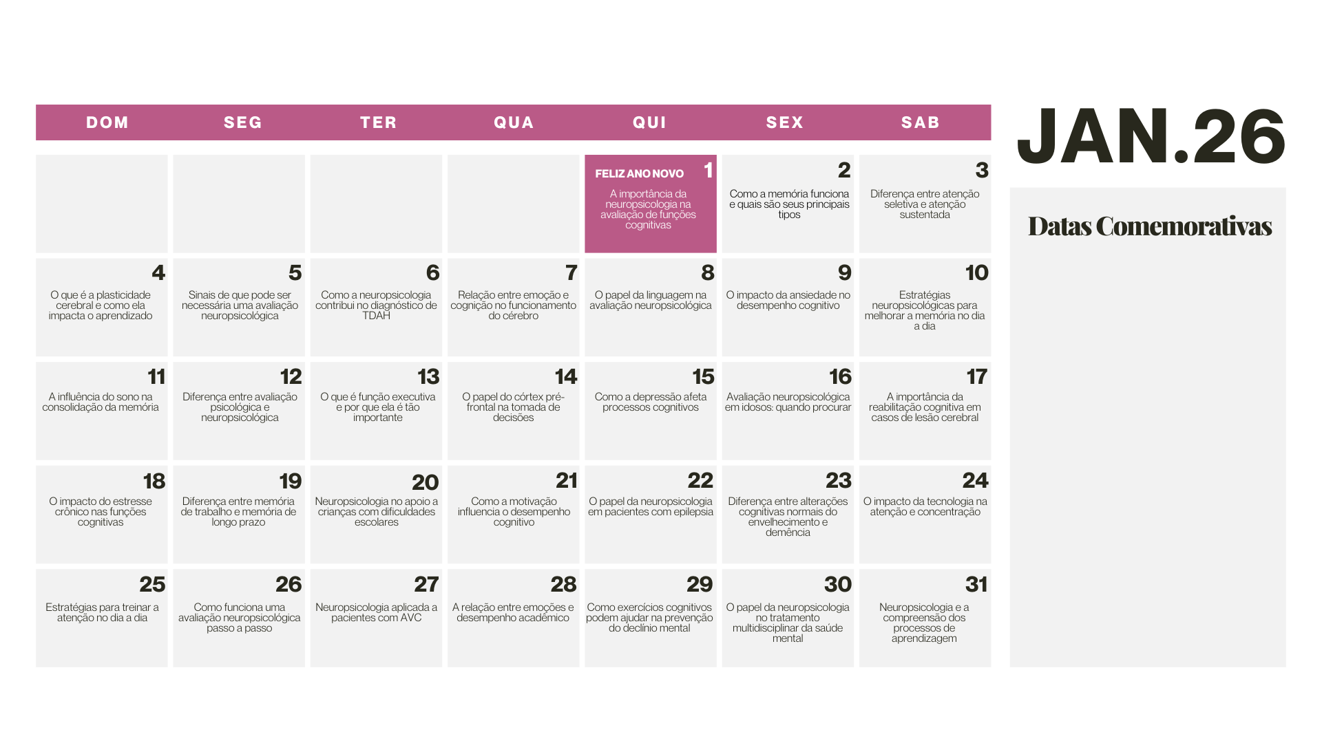 10 packs do Combo Psicologia já acompanham um calendário exclusivo com ideias de conteúdo para todos os dias de 2026 — totalmente alinhado com o tema do Pack e pensado para facilitar sua rotina de postagens.