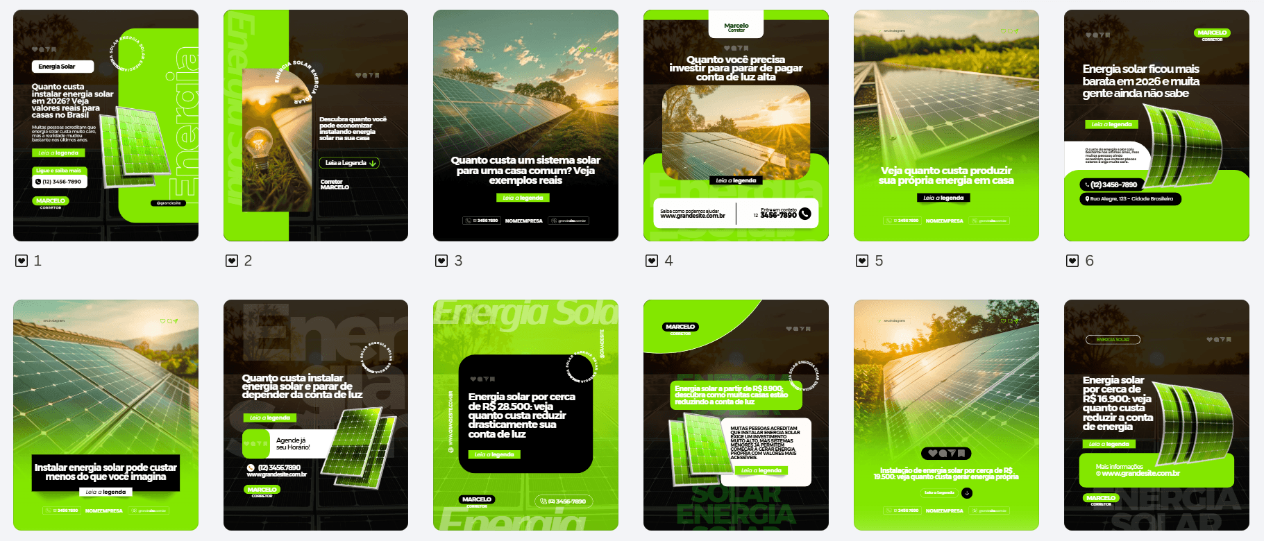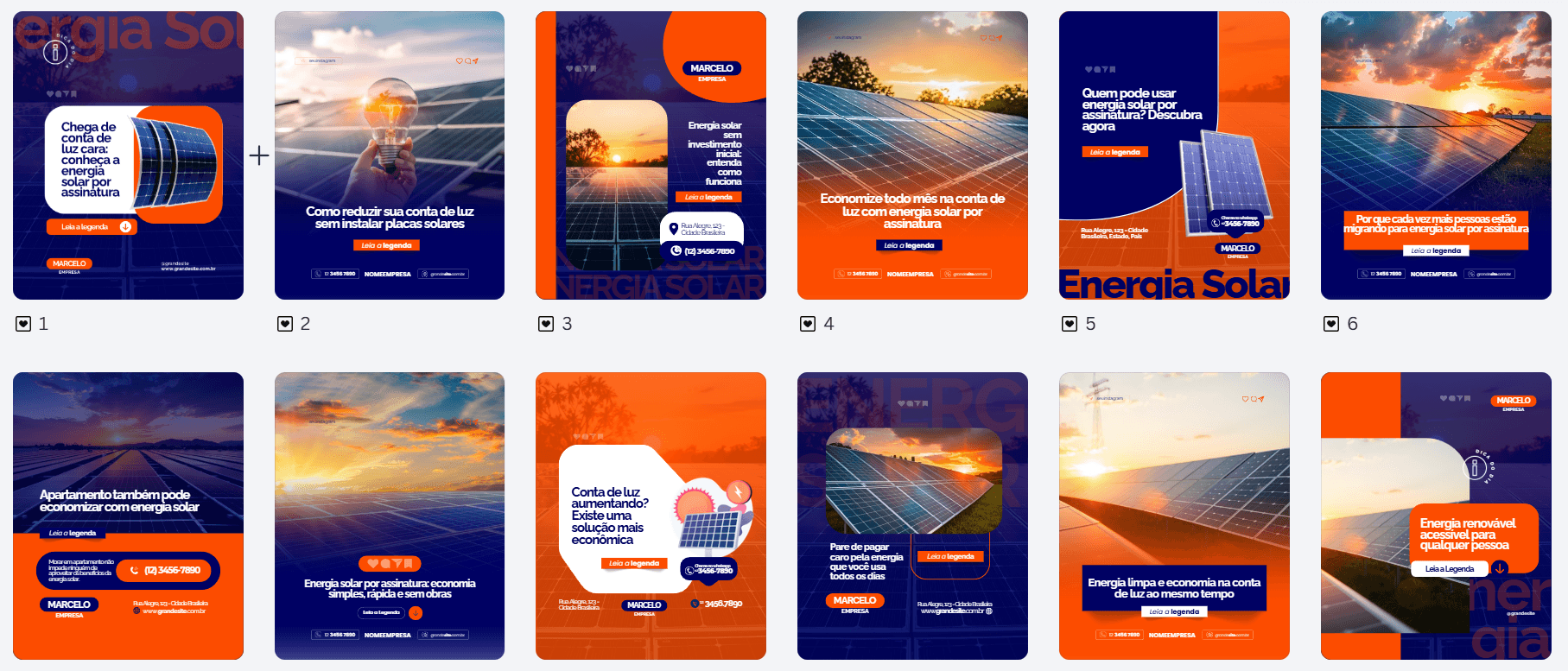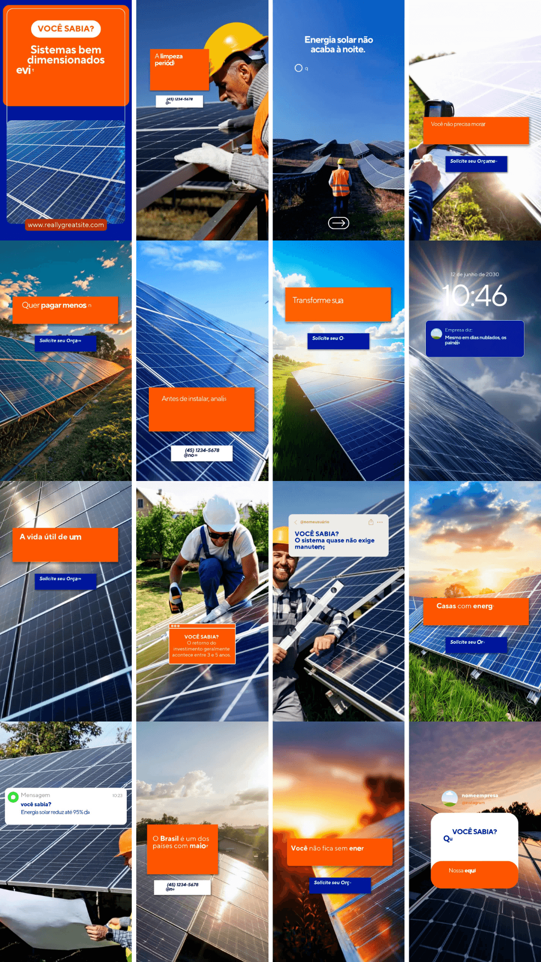 Com artes prontas, legendas incluídas e design pensado para Energia Solar, você edita e posta em minutos — e dedica seu tempo ao que realmente importa: seu cliente.