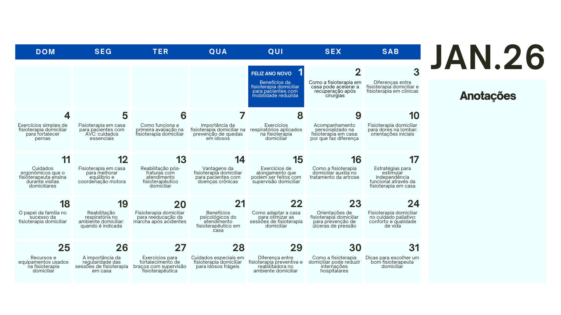 5 packs do Combo Fisioterapia já acompanham um calendário exclusivo com ideias de conteúdo para todos os dias de 2026 — totalmente alinhado com o universo de Fisioterapia pensado para facilitar sua rotina de postagens.