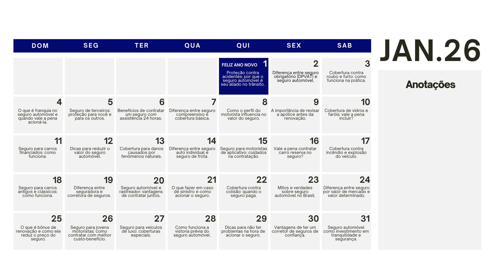 packs do Combo SEGUROS já acompanham um calendário exclusivo com ideias de conteúdo para todos os dias de 2026 — totalmente alinhado com o universo de Seguros pensado para facilitar sua rotina de postagens.