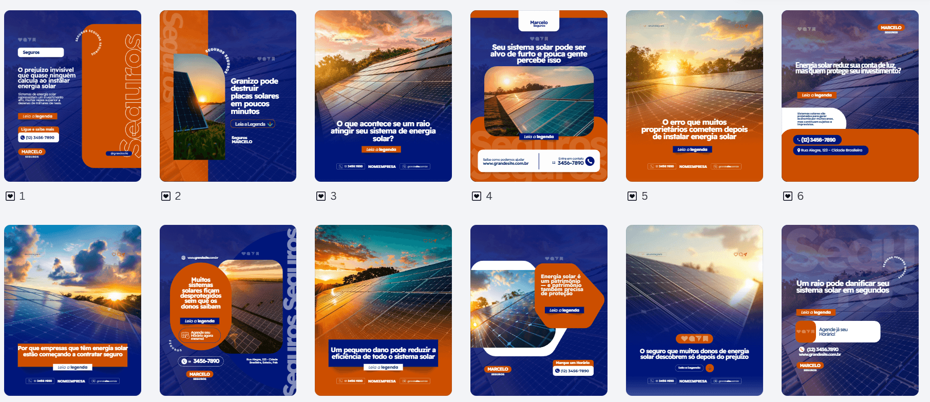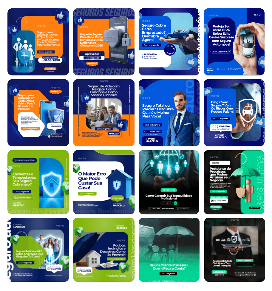 Esqueça os templates genéricos. O Combo Seguros entrega artes criadas especialmente para área de Seguros, com identidade visual pensada para refletir sua Autoridade e Profissionalismo.
