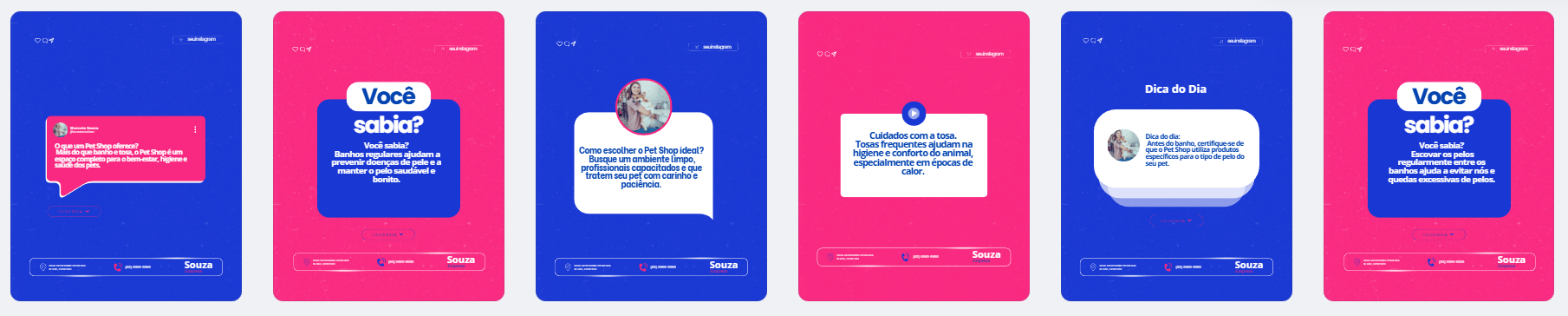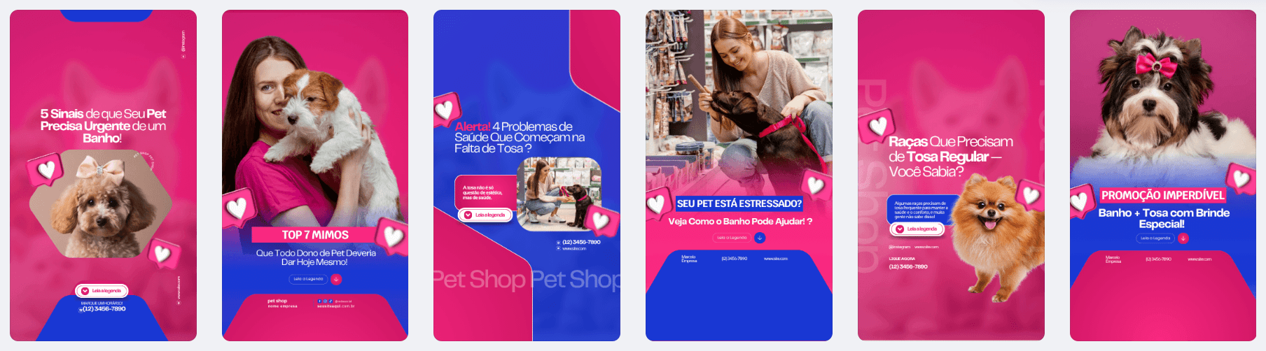Com o Pack PET SHOP, você atrai os clientes certos com um visual que transmite confiança, autoridade e credibilidade — desde o primeiro post.